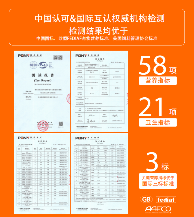 经国际权威机构谱尼测试结果显示,都乐时Dolosh南极磷虾主食冻干中58项营养指标、21项卫生指标、3项关键营养指标均优于中国国标、欧盟FEDIAF宠物营养标准和美国饲料管理协会标准。